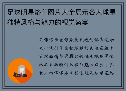 在当今的体育文化中,足球作为全球最受欢迎的运动之一,吸引了无数球迷的关注与热爱。而足球明星壁纸则成为了展示这种热情与魅力的一种独特方式。本文将围绕“足球明星壁纸精选带字幕展示让你感受足球魅力与激情的完美结合”这一中心主题进行详细阐述。文章将从四个方面探讨这一话题,包括足球明星的影响力、壁纸设计艺术、字幕展示的重要性以及如何通过这些元素激发观众的热情。通过对这些方面的深入分析,我们将更加全面地理解足...